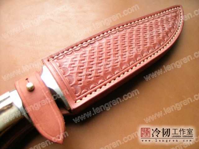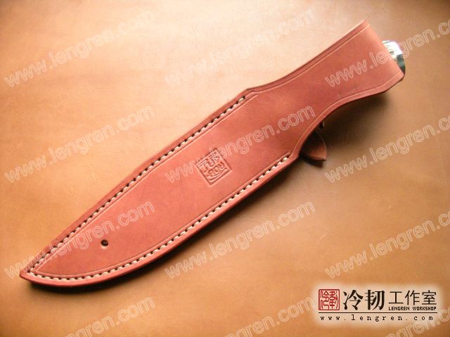 3.5mm硬质头层牛皮缝制。刀柄处按扣设计,方便快开。刀鞘背面有腰带环可佩带在要带上。刀鞘前端三层缝制,刀刃不会划伤内部缝线。结实耐用。