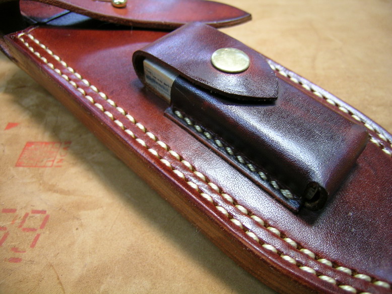 4mm头层牛皮缝制。刀柄处按扣设计,方便快开。刀鞘前端三层缝制,刀刃不会划伤内部缝线。结实耐用。刀鞘背面配有磨刀石,适合野外使用。