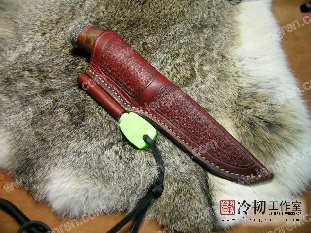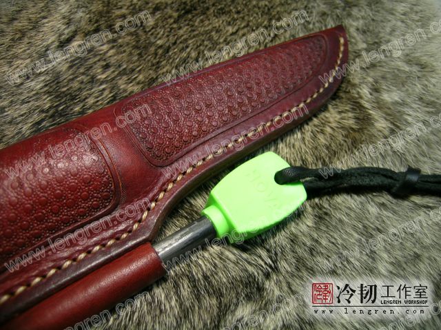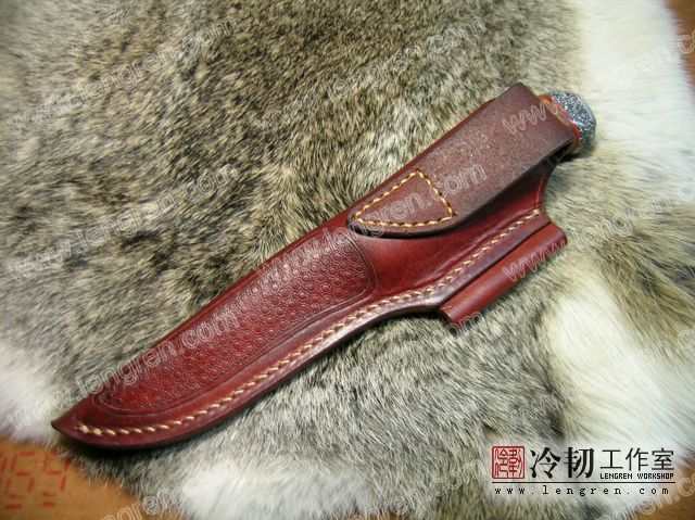 4mm头层牛皮缝制。刀鞘前端三层缝制,刀刃不会划伤内部缝线。结实耐用。刀鞘侧面配有打火石,适合野外使用。浸蜡处理+压花。