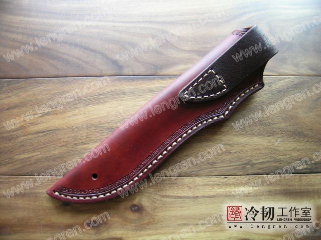4mm头层牛皮缝制。刀鞘前端三层缝制,刀刃不会划伤内部缝线。结实耐用。刀鞘压花,筒式设计。可挂腰带上。