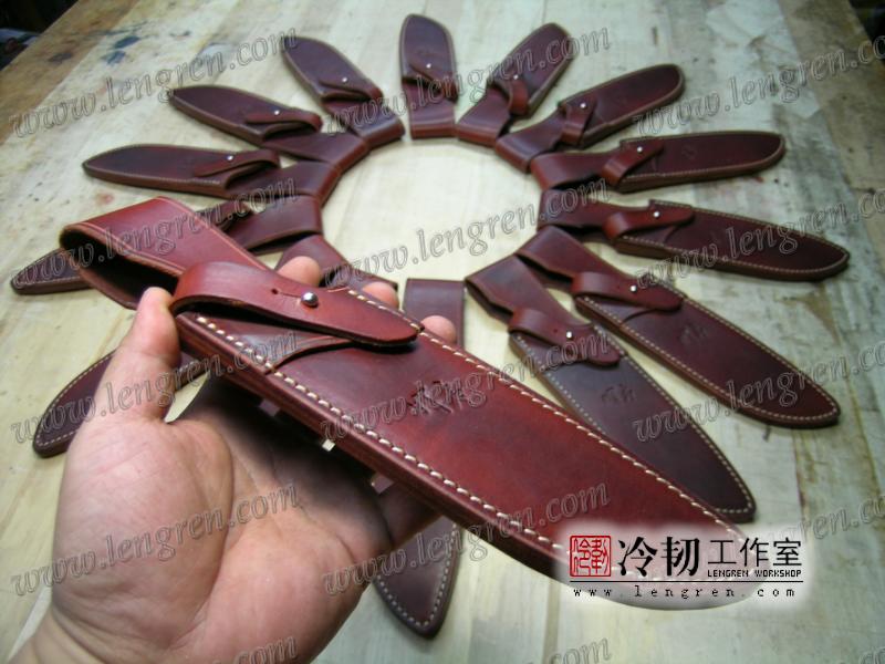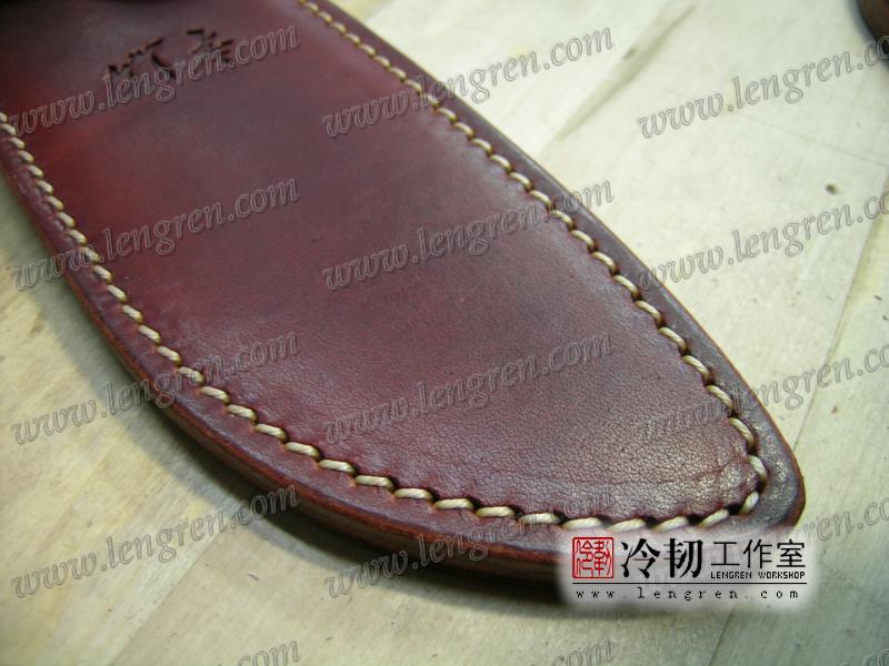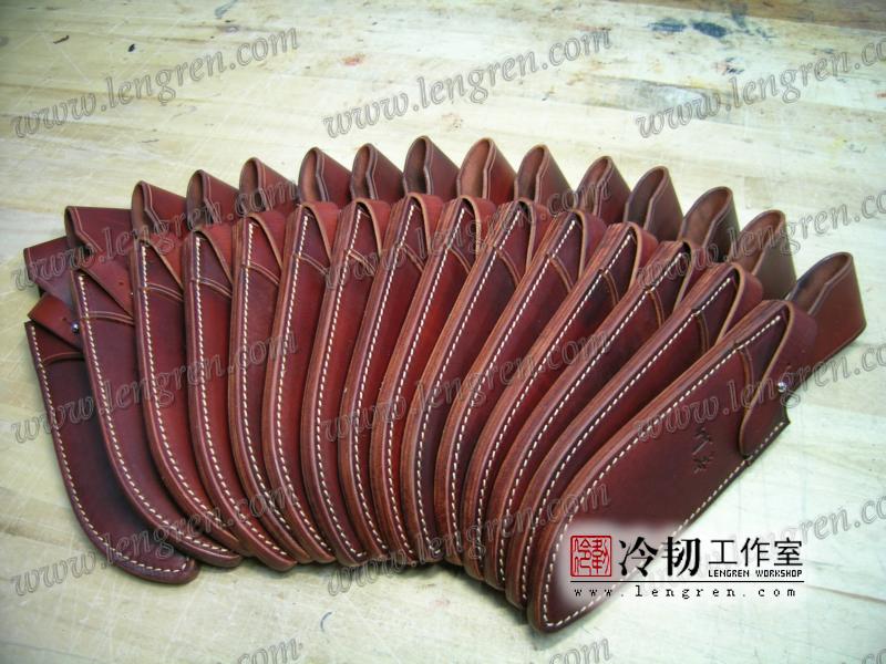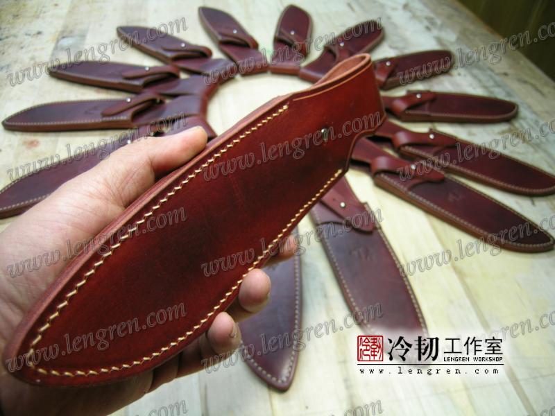 4mm头层牛皮缝制。刀鞘前端三层缝制,刀刃不会划伤内部缝线。结实耐用。浸蜡处理,具有一定放水性。可批量定制。量身裁剪。