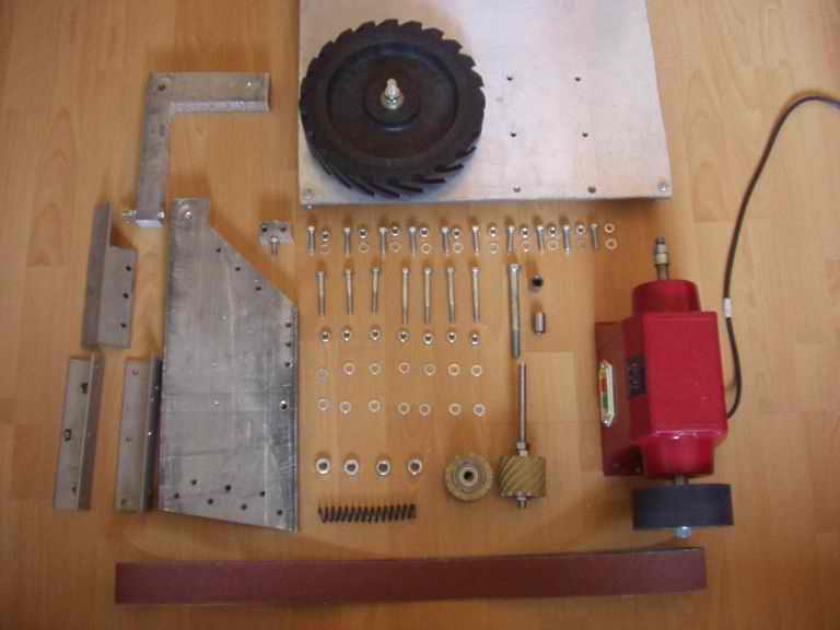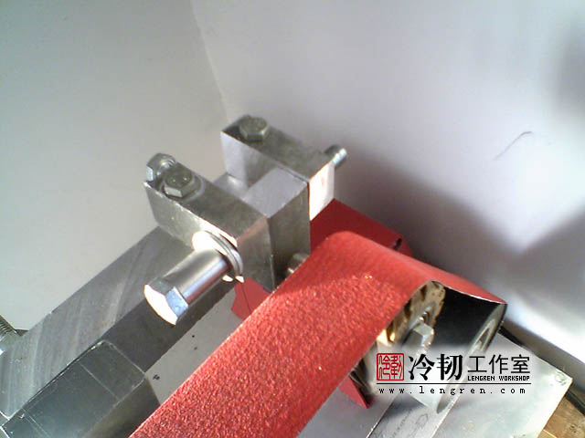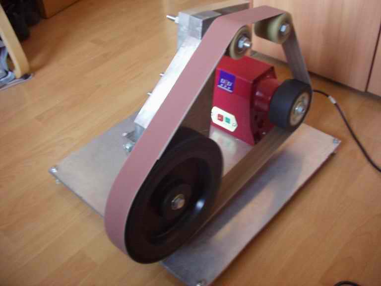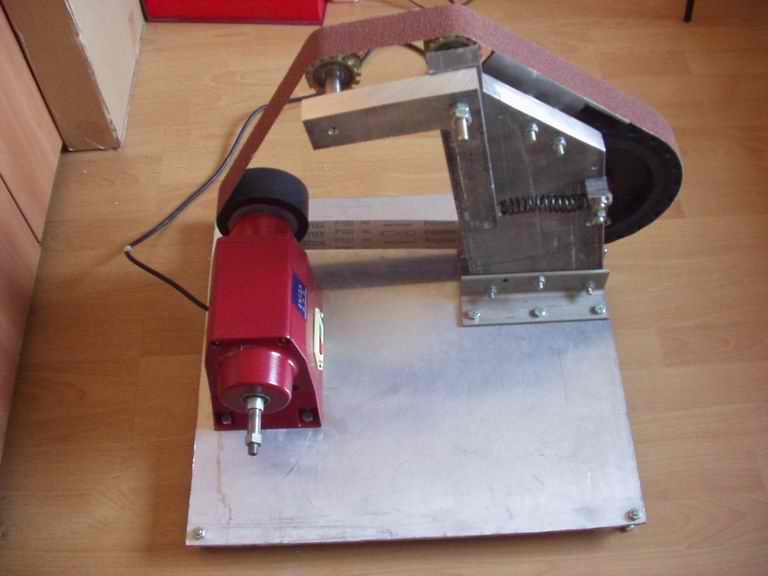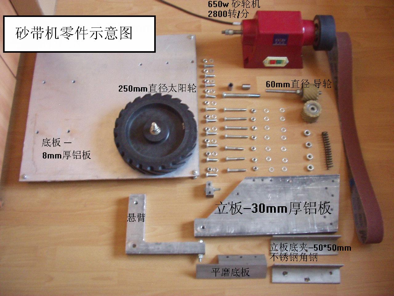这砂带机是自己设计,自己买材料,自己加工。 所用材料: 650w砂轮机 8mm厚度铝板(550*490mm见方) 30mm厚度铝板(180*400mm) 50*50*200mm 不锈钢角钢 三段 250mm直径 太阳轮 120mm直径 主动轮 60mm 直径 导轮 2个 弹簧 一根 8*30 螺栓 10 套 8*50 螺栓 2 套 8*55 螺栓 3 套 8*75 螺栓 4 套 12*120螺栓 1 套 12*90 螺栓 1 套 12*180 丝杠 1 根