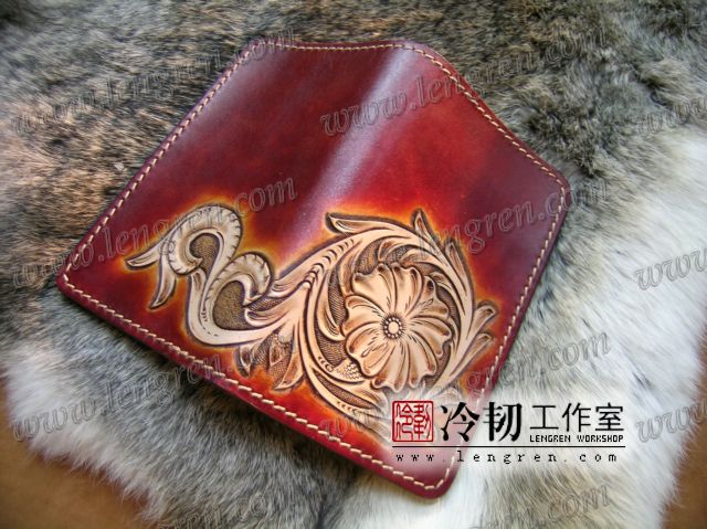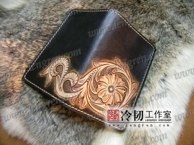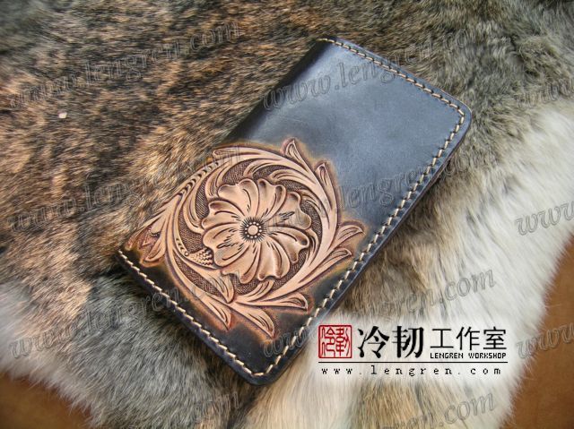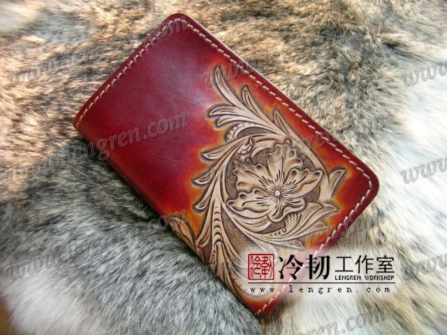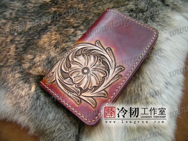 中长款钱包,头层牛皮缝制,5卡位,拉锁包,方便放在衣服兜里。可放三千左右现金。手工雕刻唐草花纹,彩色。