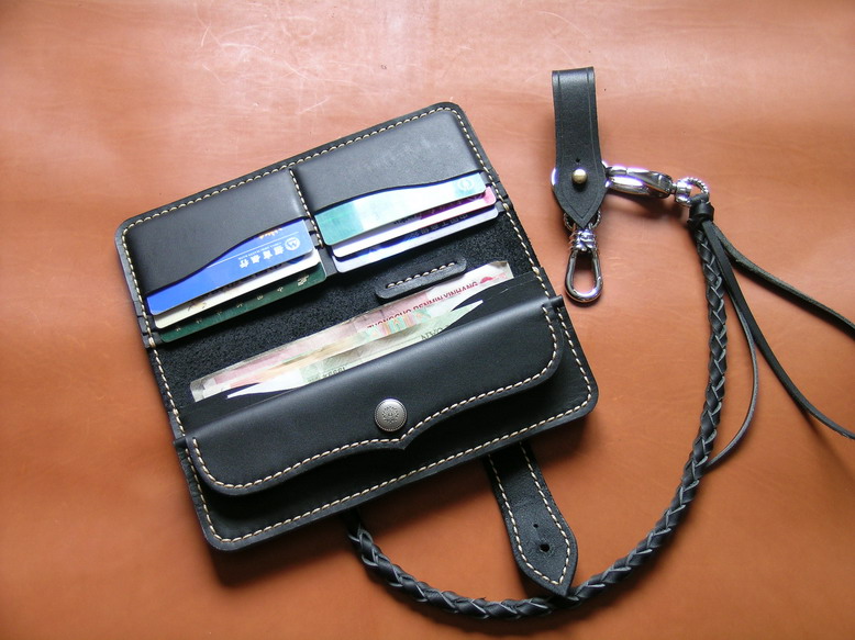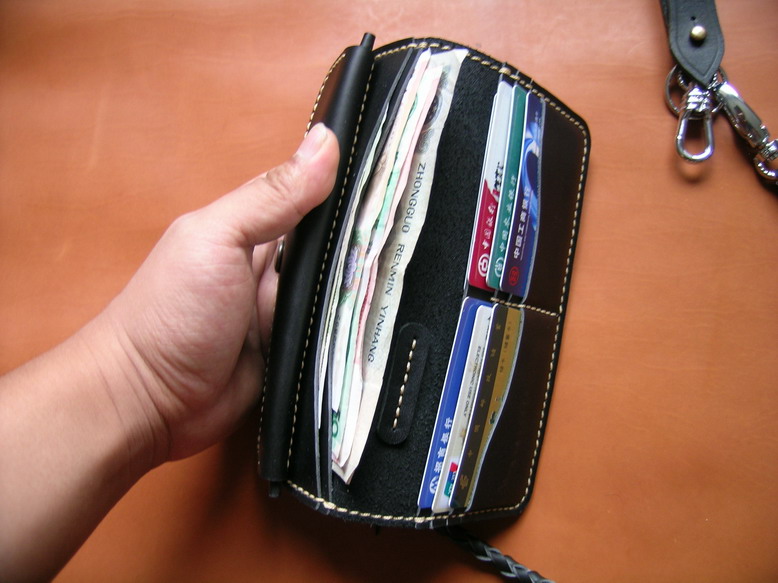 头层牛皮缝制,6卡位,零钱袋,可放6000元左右现金。配编织皮链。