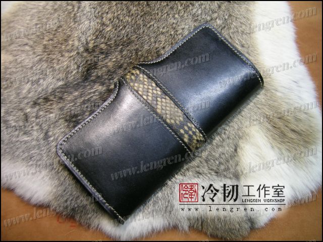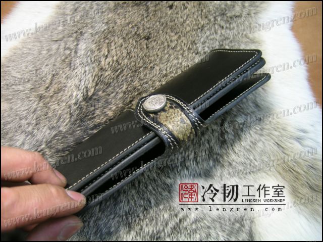 头层牛皮缝制,镶嵌蟒蛇皮。6卡位,零钱包,925银装饰扣。