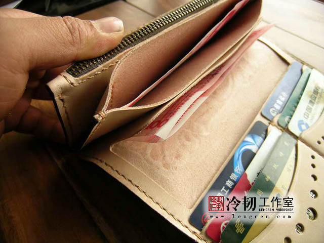 头层牛皮缝制,手工雕刻染色,6卡位,拉锁零钱包。925银装饰扣。