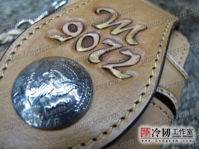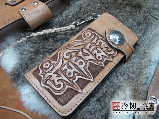 头层牛皮缝制,手工雕刻染色,六字箴言纹。10卡位,拉锁零钱包。925银装饰扣,硬币扣可选。牛皮外挂,编织皮链,纯铜金属挂钩。机车骑士绝配。