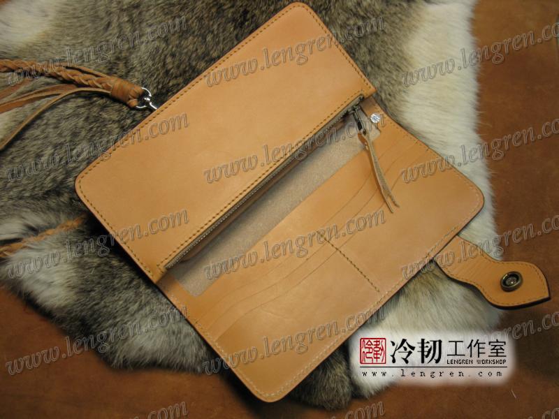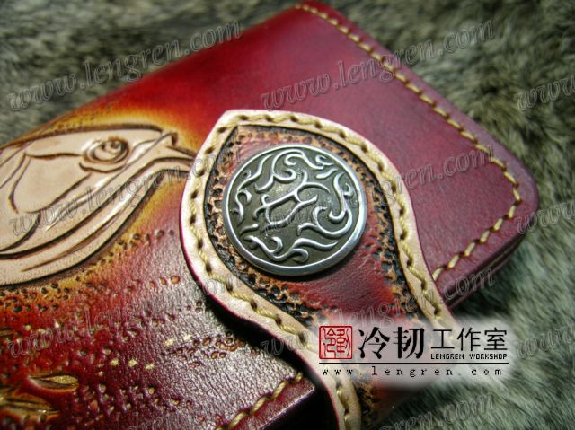 头层牛皮缝制,手工雕刻染色,龙鱼纹。10卡位,拉锁零钱包。925银装饰扣,硬币扣可选。牛皮外挂,编织皮链,纯铜金属挂钩。