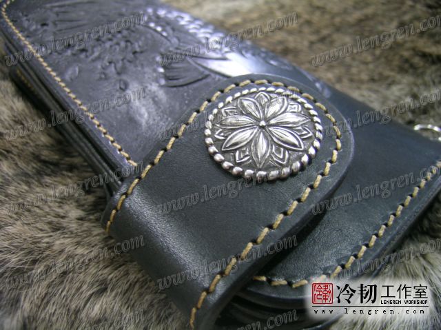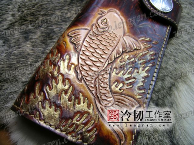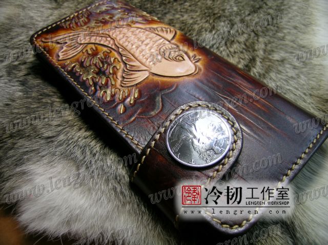 头层牛皮缝制,手工雕刻染色,鲤鱼纹。10卡位,拉锁零钱包。925银装饰扣,硬币扣可选。