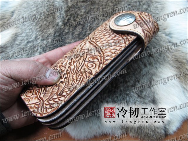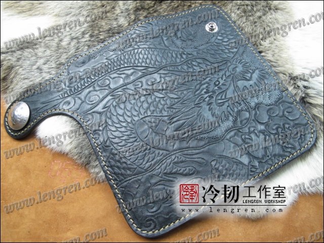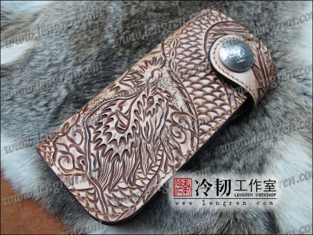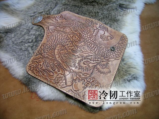 头层牛皮缝制,手工雕刻染色,盘龙纹。10卡位,拉锁零钱包。925银装饰扣,硬币扣可选。可选配牛皮编织皮链,纯铜链,纯铜金属挂钩。
