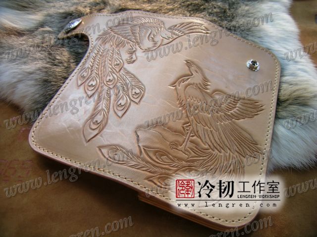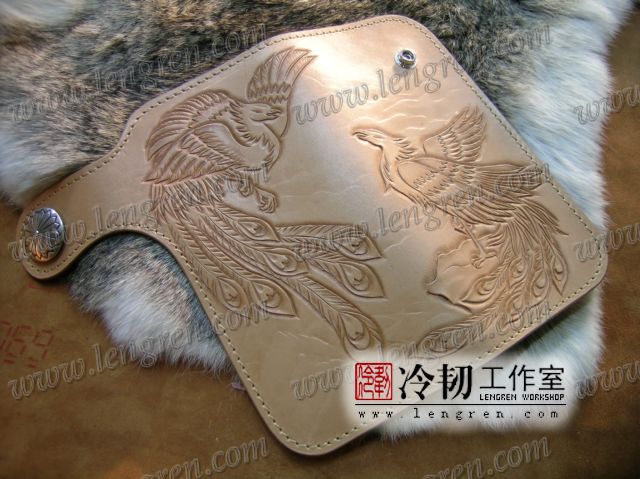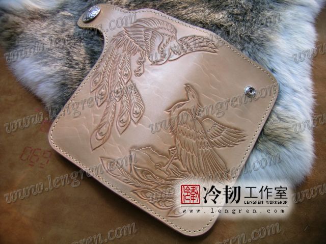 头层牛皮缝制,手工雕刻染色,凤纹。10卡位,拉锁零钱包。925银装饰扣,硬币扣可选。可选配牛皮编织皮链,纯铜链,纯铜金属挂钩。