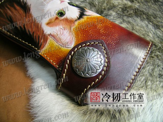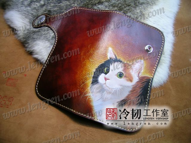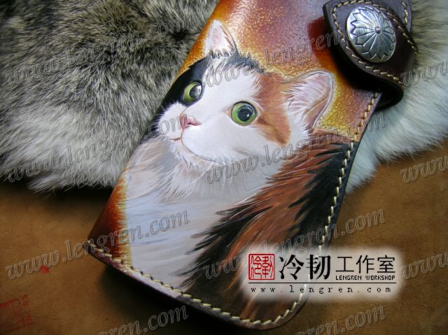 头层牛皮缝制,手工雕刻染色。10卡位,拉锁零钱包。925银装饰扣,硬币扣可选。可选配牛皮编织皮链,纯铜链,纯铜金属挂钩。图案为客户家的猫咪,按照写真照片皮雕+彩绘制作。